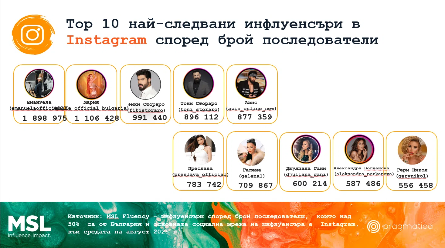 в Instagram водещото име е поп-фолк певицата Емануела, в TikTok - близначките Сузи и Рени, а короната в YouTube носи Слави Панайотов, по-известен като „Клашъра“.