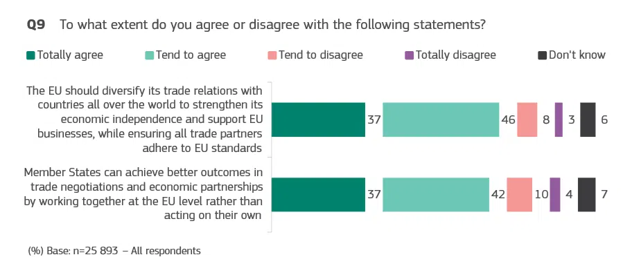 Голямо мнозинство от европейците считат, че държавите членки могат да постигнат по-добри резултати в търговските преговори и икономическите партньорства, като работят заедно на равнище ЕС, а не действат самостоятелно (79%), и че ЕС следва да разнообрази търговските си отношения с държави от целия свят, за да укрепи икономическата си независимост и да подкрепи бизнеса в ЕС (83%).