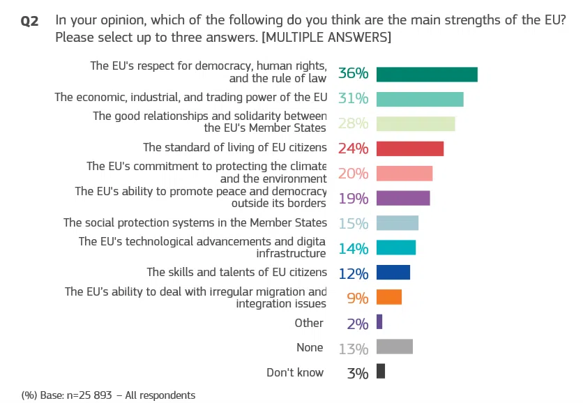 Зачитането на демокрацията, правата на човека и върховенството на закона (36%), заедно с икономическата, индустриалната и търговската мощ на ЕС (31%) остават основните силни страни на ЕС, следвани от добрите отношения и солидарността между държавите членки на ЕС (28%).