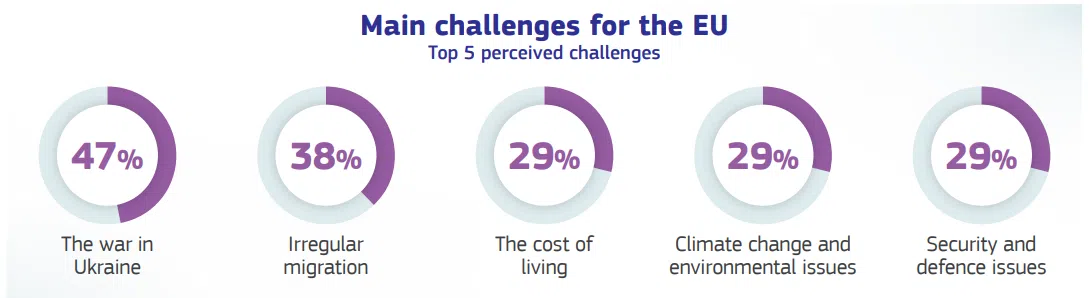 По отношение на общите политически приоритети 34% от европейците посочват сигурността и отбраната сред областите, които ЕС трябва да разглежда като приоритетни, следвани от 32%, които посочват незаконната миграция, и 27%, които посочват войната в Украйна.