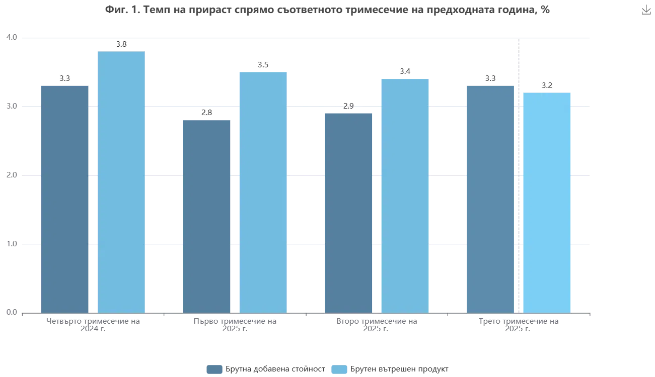 През третото тримесечие на 2025 г. БВП се увеличава с 3.2% спрямо третото тримесечие на предходната година. Брутната добавена стойност нараства с 3.3% по сезонно изгладени данни.