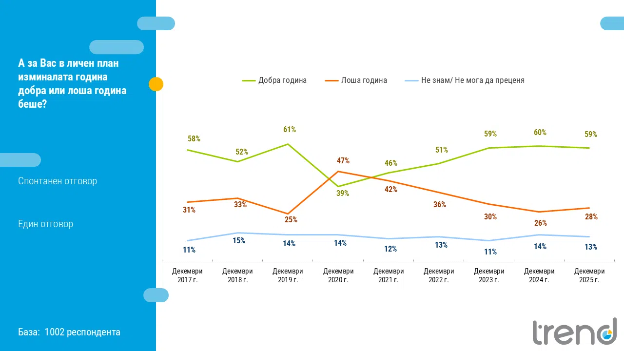 Това показват резултатите от новото социологическо проучване на агенция "Тренд" относно нагласите спрямо отминаващата 2025 и предстоящата 2026 г. То е проведено между 29 ноември и 5 декември 2025 г. по поръчка на в. "24 часа".