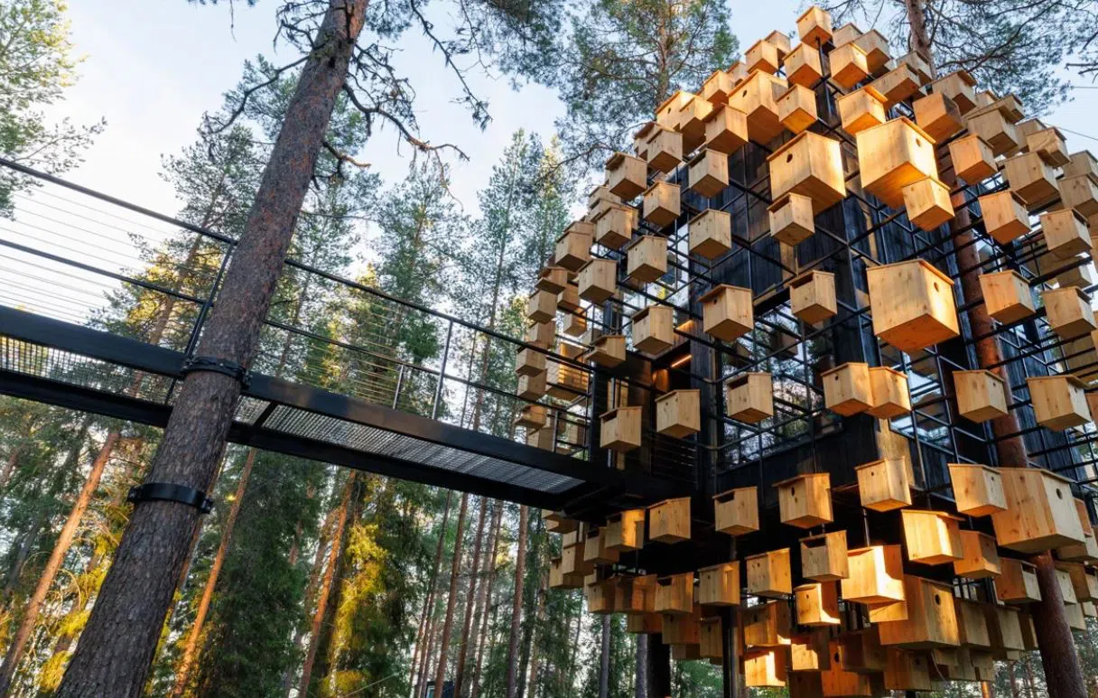 Стъклената Биосфера е осеяна с 350 къщички за птици. Тази структура е част от Treehotel, който разполага с осем различни дизайна и се намира в шведската част на Лапландия.