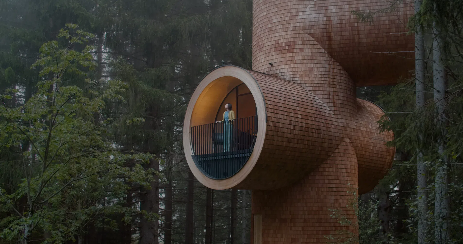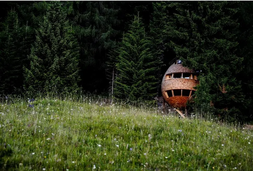 На 1200 метра надморска височина, с невероятна гледка към италианските Алпи, са разположени две къщички на дървета с формата на борови шишарки. За да се слеят с природата наоколо, за създаването им са използвани смърч и лиственица.