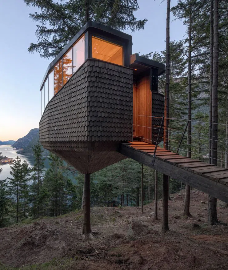 Къщичката изглежда сякаш стои на един крак. Всъщност е достатъчно широка, за да побере четири души, има си баня и спираща дъха гледка към шведския фиорд Хардангер.