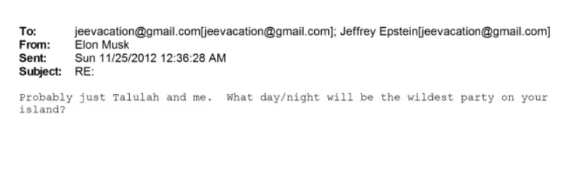 В имейл от ноември 2012 г. Епстийн му предлага да изпрати частен хеликоптер, който да го транспортира до острова, и пита: „Колко души ще пътуват с хеликоптера до острова?“ Мъск отговаря, че ще бъдат само той и Райли, и пита: „В кой ден/нощ ще е най-дивото парти на острова?“