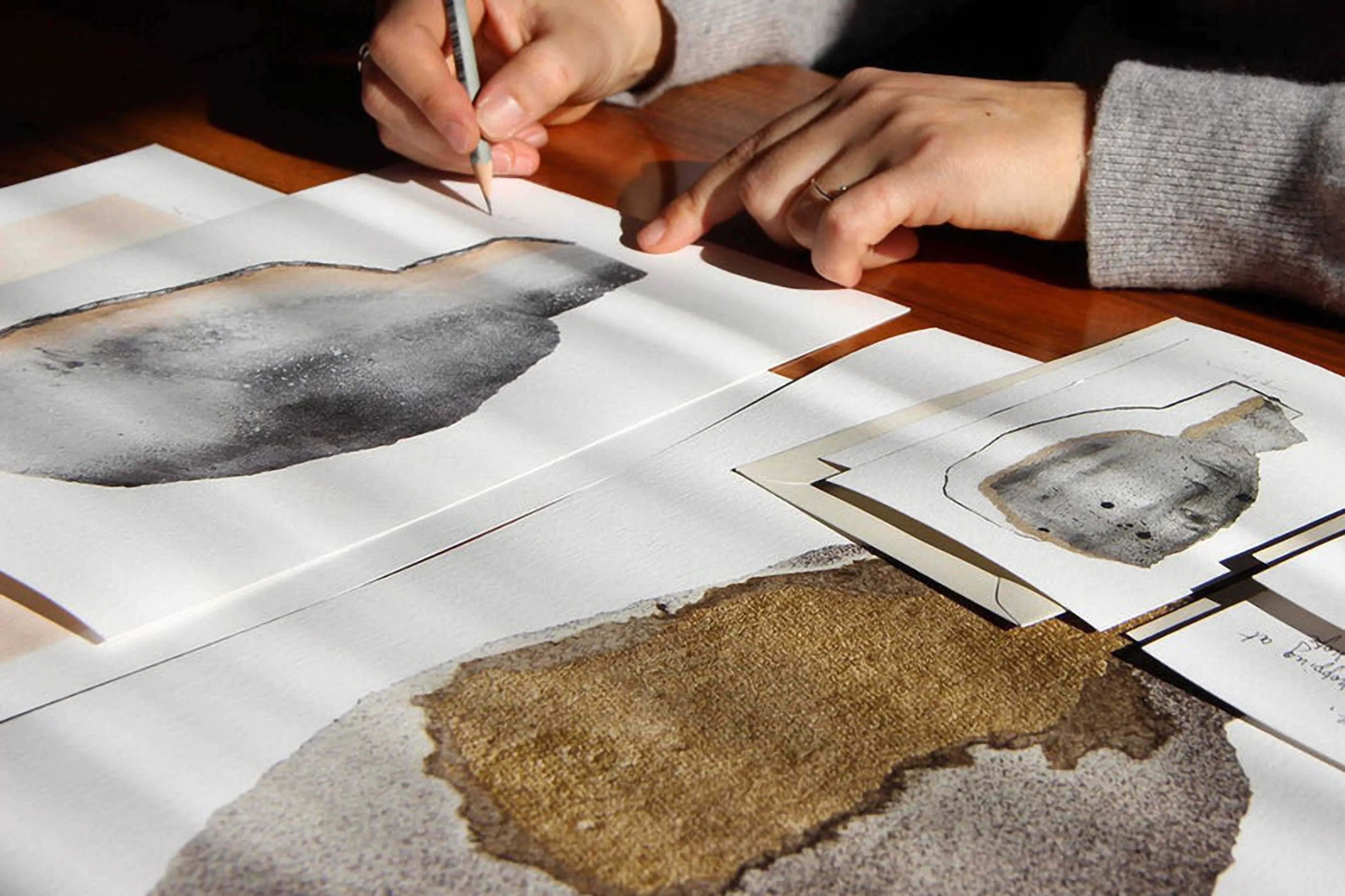 Хартията е крехката сила в красивите минималистични сюжети на Боряна Михайловска. Материя, която тя разкъсва, наслагва и комбинира различни текстури, използвайки акрил и метални спрейове. По думите ѝ този метод по естествен път ограничава контрола върху крайния резултат и прави образите по-истински – както в живота, където намеренията ни рядко се развиват според предварителния план. От тези оригинални колажи се раждат и художествените принтове, които правят творбите достъпни за по-широка публика.