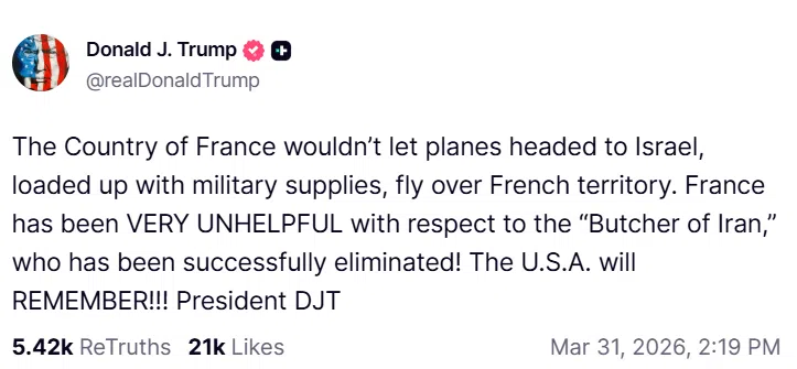 В публикация в социалната си мрежа Truth Social той заявява: „Франция не позволи на самолети, летящи към Израел и натоварени с военни доставки, да прелетят над френска територия“ и допълва, че страната е отказала да съдейства по отношение на „Касапина на Иран“, който беше успешно елиминиран!“