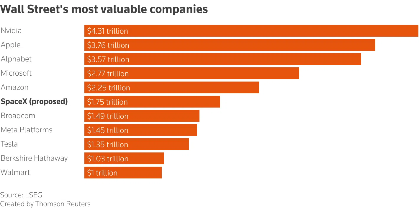 Според обичайните показатели на Уолстрийт, отговорът е: много далеч. SpaceX веднага ще се превърне в шестата най-ценна публично търгувана компания в САЩ, с по-голяма стойност от Meta Platforms например, която е публично търгувана от повече от десетилетие, както и Berkshire Hathaway на Уорън Бъфет, която е по-стара от самия Мъск, отбелязва в анализ Reuters.
