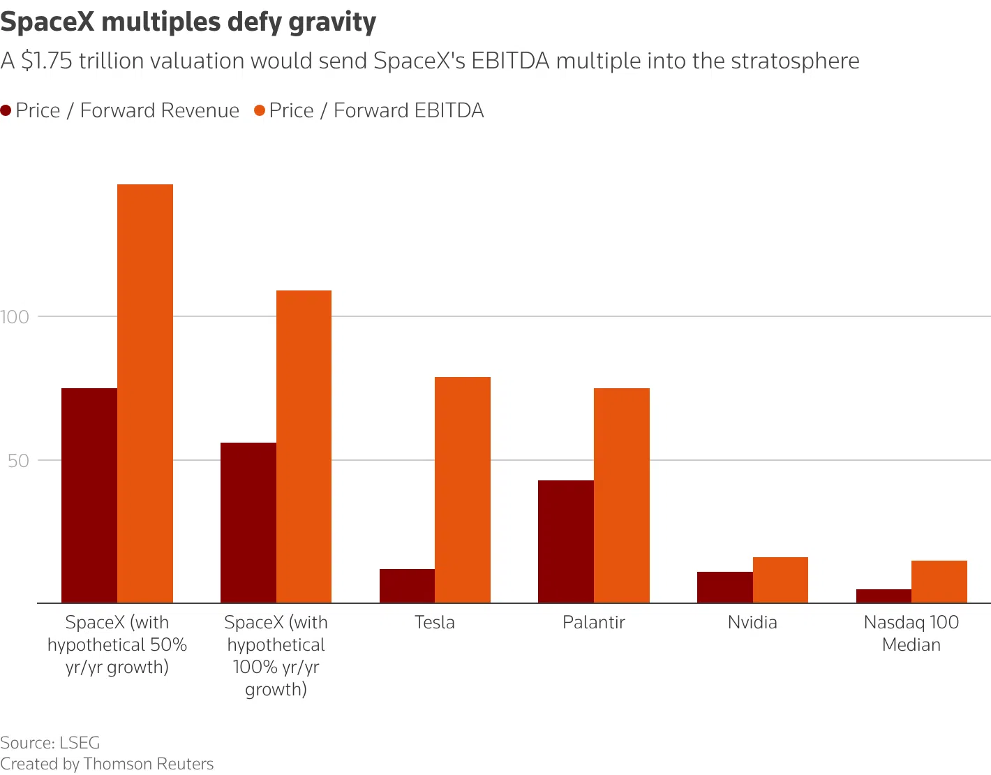 Използвайки тези предположения, при капитализация от 1,75 трилиона долара, SpaceX би имала мултипликатор цена/приходи от 56 и мултипликатор цена/EBITDA от 109 – зашеметяващи оценки дори за най-бързо растящите компании.