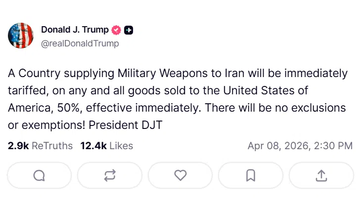 „Страна, която доставя военно оръжие на Иран, ще бъде незабавно обложена с мито от 50% върху всички стоки, продавани на Съединените американски щати, в сила незабавно. Няма да има изключения или освобождавания!“, гласи публикацията на президента.