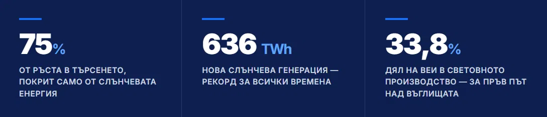 - Нов слънчев капацитет: 647 GW - с 11% повече от 2024 г.