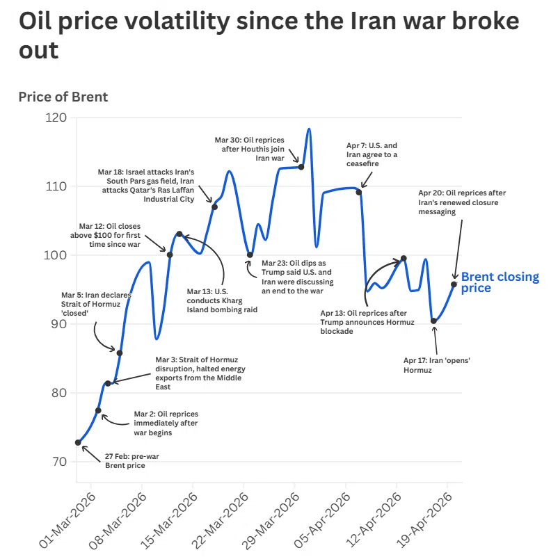 Цените отново скочиха на 20 април, след като ден по-рано американските военноморски сили обстреляха и задържаха ирански контейнеровоз в Оманския залив.