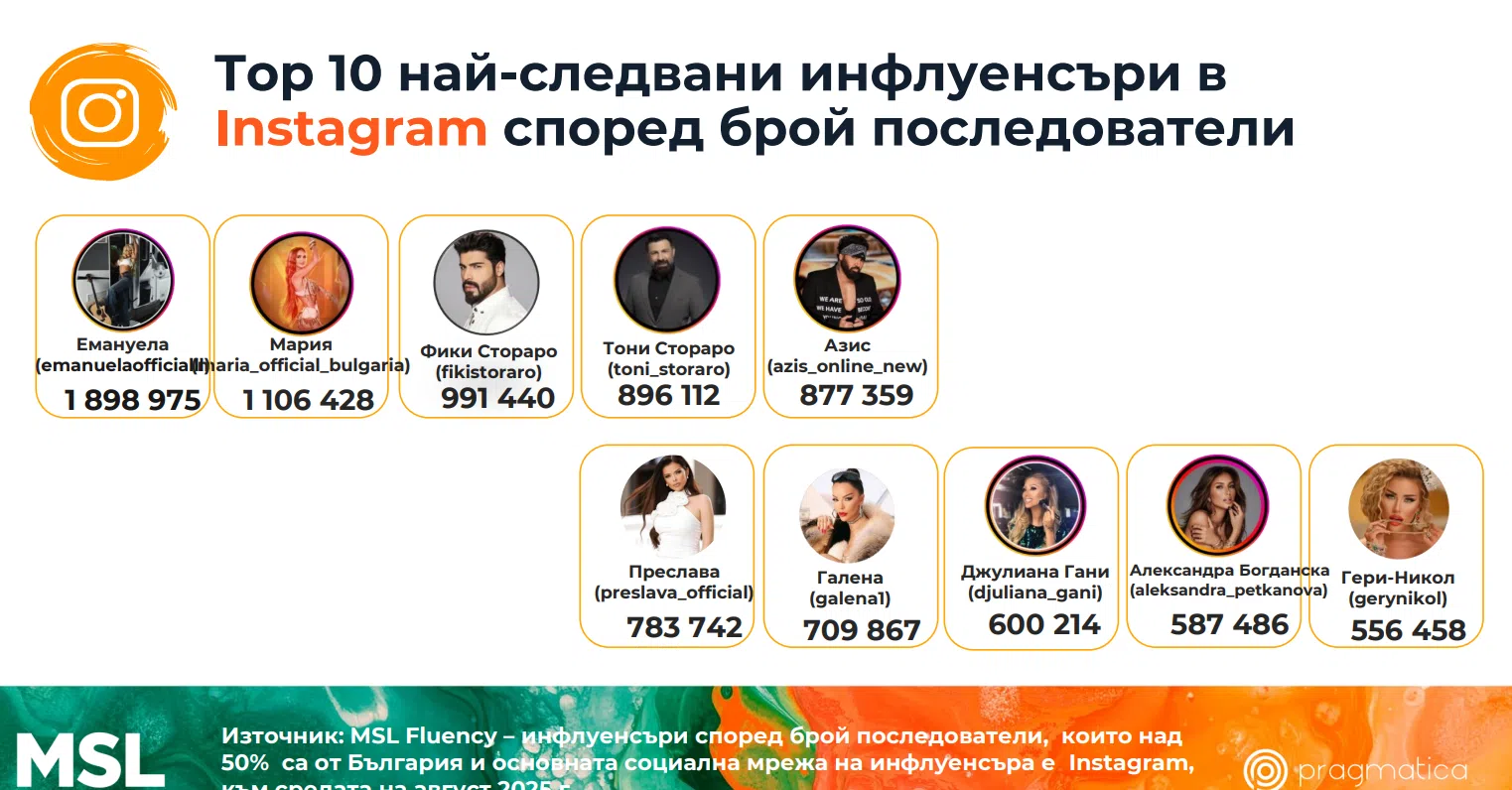 в Instagram водещото име е поп-фолк певицата Емануела, в TikTok - близначките Сузи и Рени, а короната в YouTube носи Слави Панайотов, по-известен като „Клашъра“.