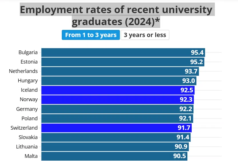 Норвегия отбелязва най-високата степен на заетост, като 93,3% от наскоро завършилите висше образование са наети на работа.