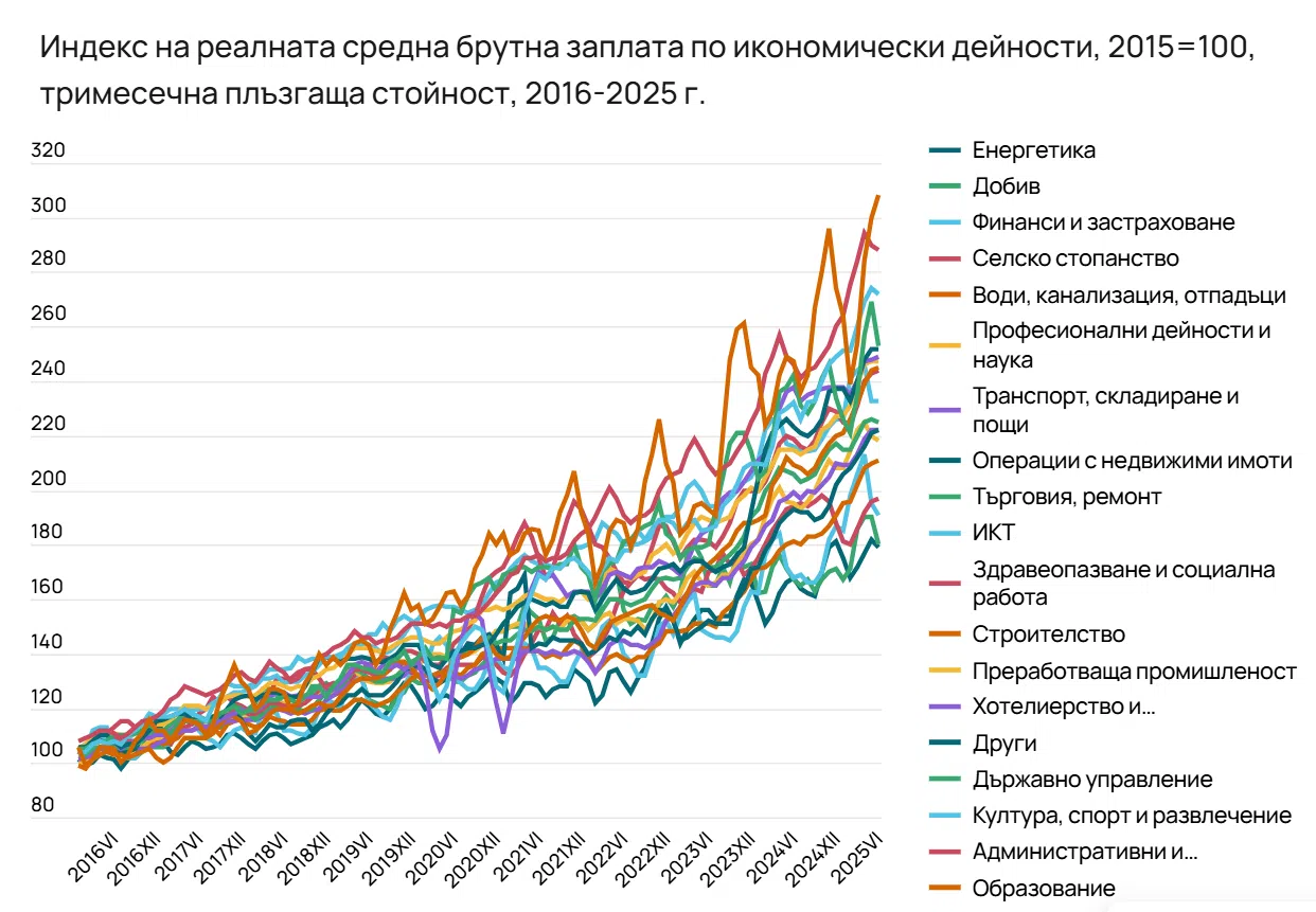В периода между 2015 и средата на 2025 г. най-голям ръст в заплатите на секторно ниво се наблюдава в образованието – 180-200%