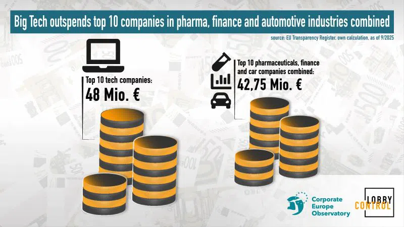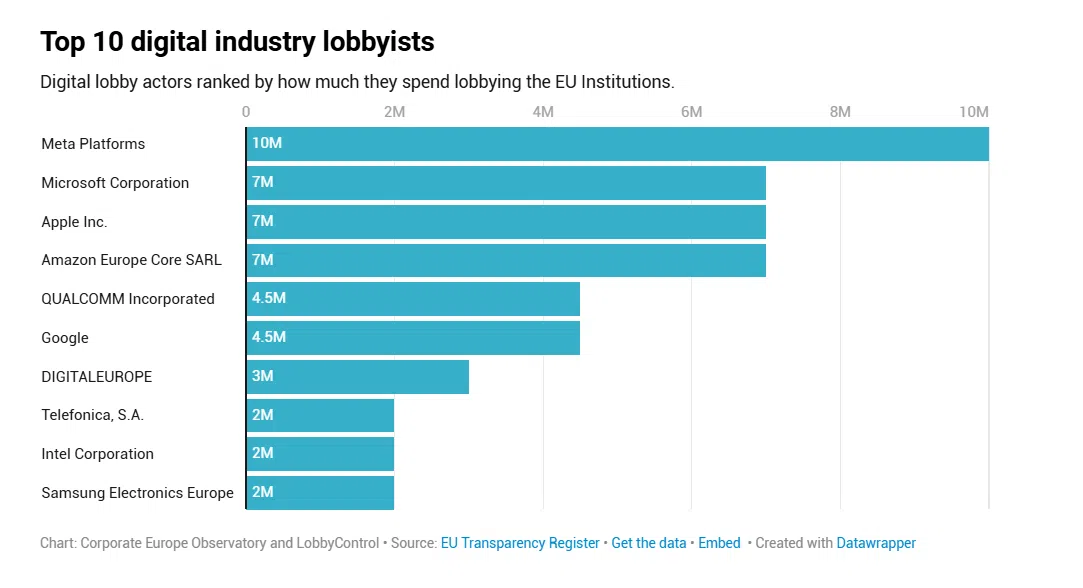 Проучването, което се основава на публични данни от Регистъра за прозрачност на ЕС, показва, че 10 компании – Meta, Microsoft, Apple, Amazon, Qualcomm, Google, Digital Europe, Telefonica, Intel и Samsung, са отговорни за разходи в размер на 49 милиона евро, в сравнение с 40 милиона евро преди две години.