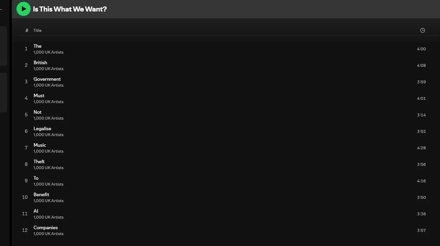 Заглавията в списъка с песни са подредени така, че да изпишат фразата „Британското правителство не трябва да узаконява кражбата на музика в полза на AI компании“.