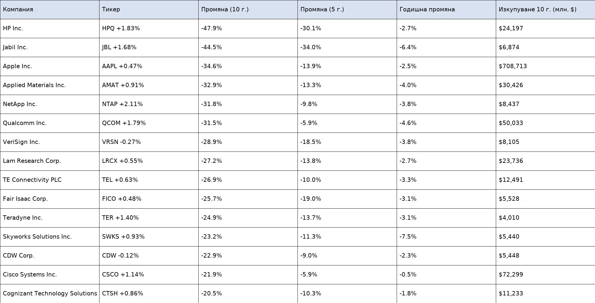 Технологичните компании с най-голямо намаляване на броя акции