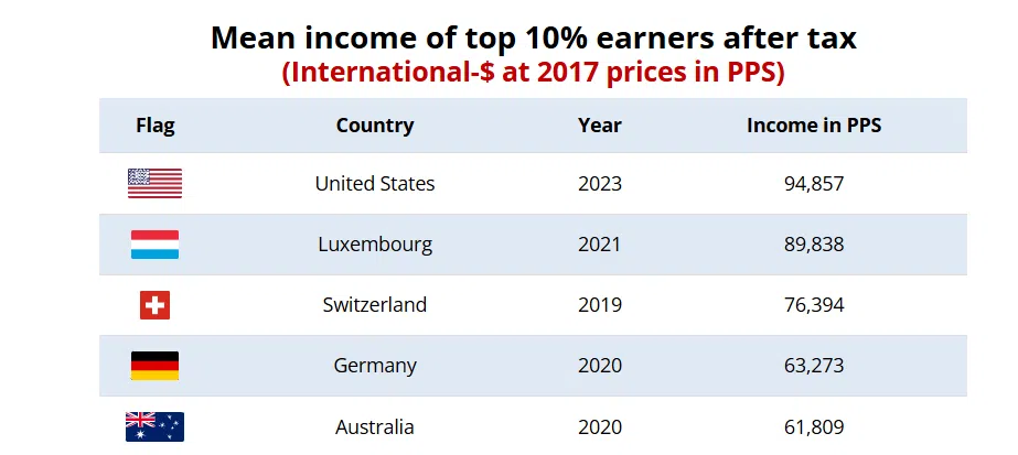 САЩ имат най-високия среден доход за най-богатите 10% на година, достигащ 94 857 PPS. Люксембург е втора с най-високия доход след данъци за най-богатите 10% в Европа, а Швейцария е трета. Германия и Австралия допълват Топ 5.