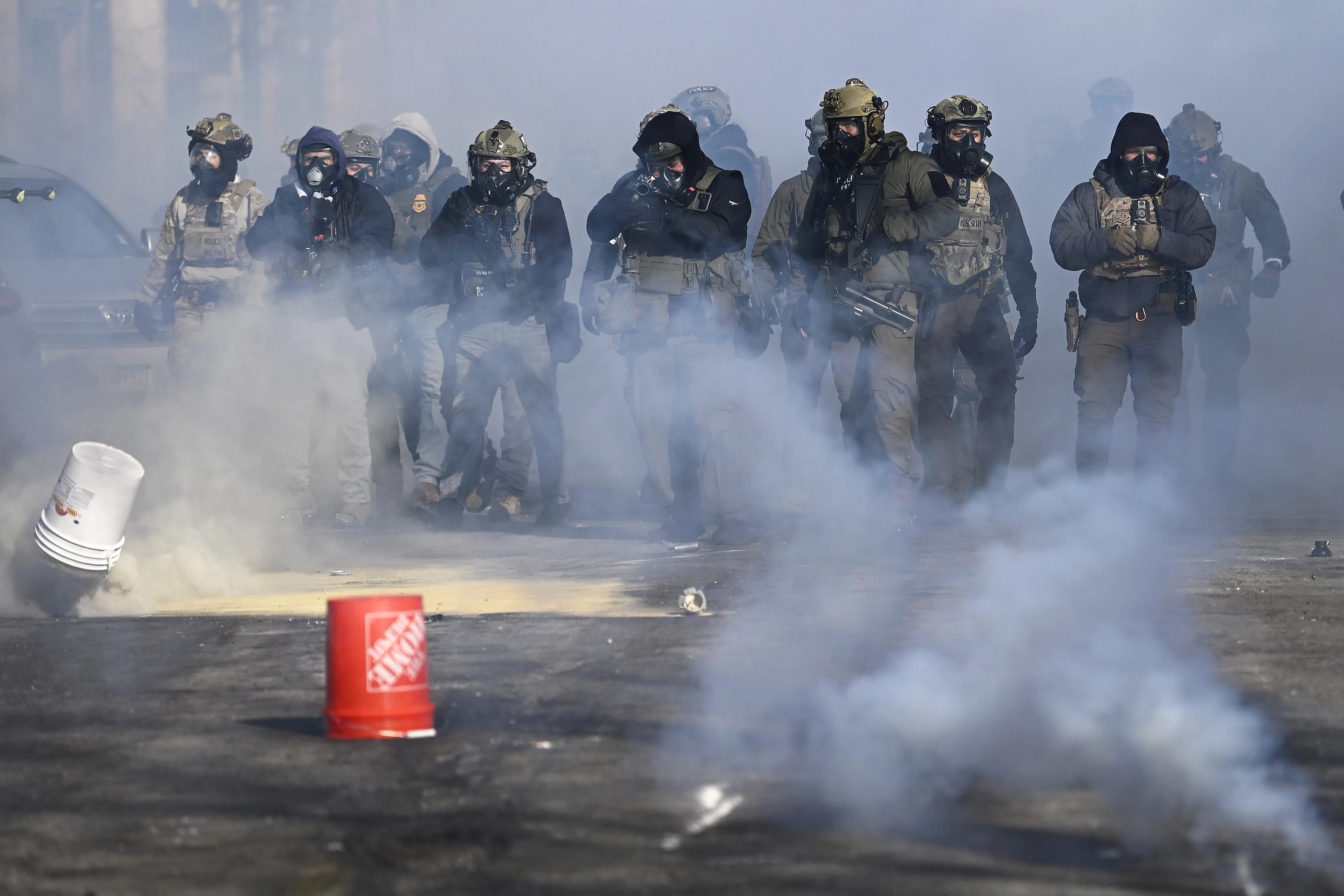 Сред изстрели и писъци хората, които наблюдаваха и снимаха федералните агенти, продължиха да надуват свирки и да им крещят.