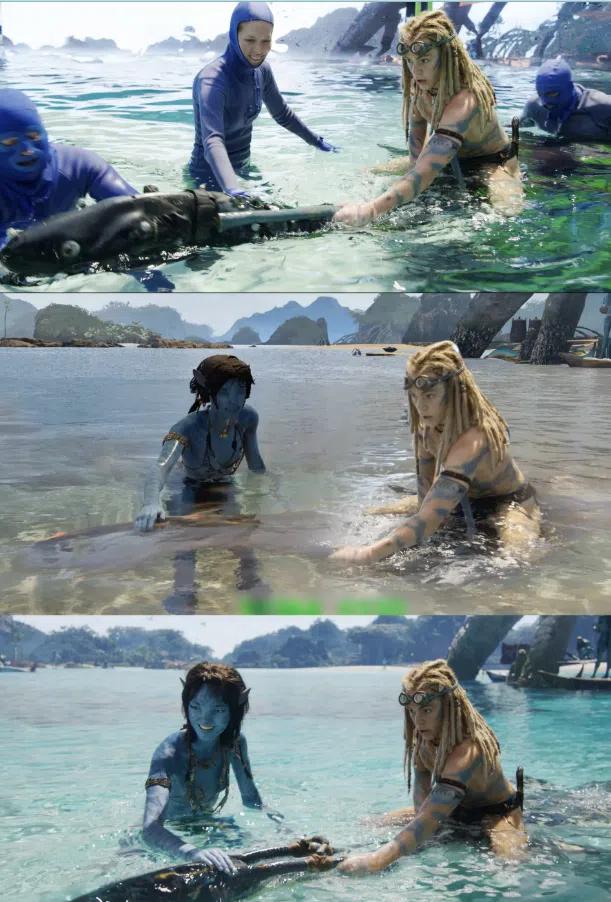 „Тази сцена беше заснета в плитък басейн в Нова Зеландия. Актьорът седеше на седло, подготвено на подходящата за камерата височина, докато движенията на Илу бяха изпълнени от нашия каскадьорски екип в сини костюми. LED екрани бяха отразени в огледала, за да се проектират околната среда и отраженията върху водната повърхност“, споделя Сайндън.