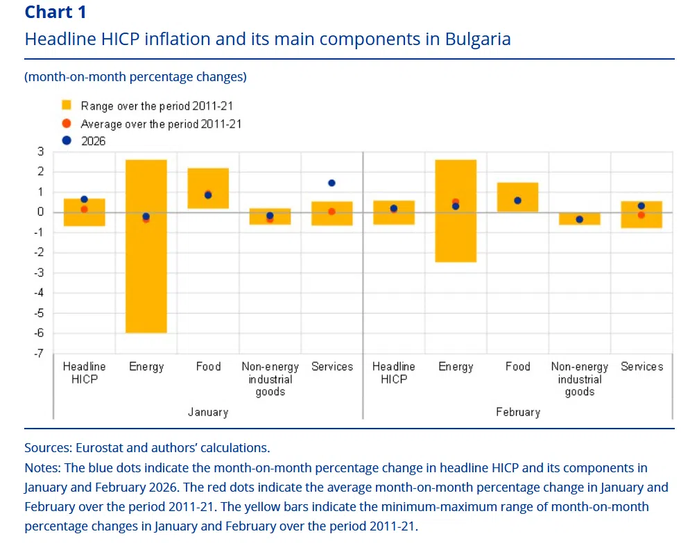 Цените се повишават с 0,6% през януари 2026 г. в сравнение с декември 2025 г., т.е. преди въвеждането на еврото. Тази цифра е необичайно висока за типичен януари. Така че, макар инфлацията да продължава да следва низходяща тенденция, се наблюдава леко повишение след преминаването към еврото на месечна база, отбелязва в публикацията си ЕЦБ.