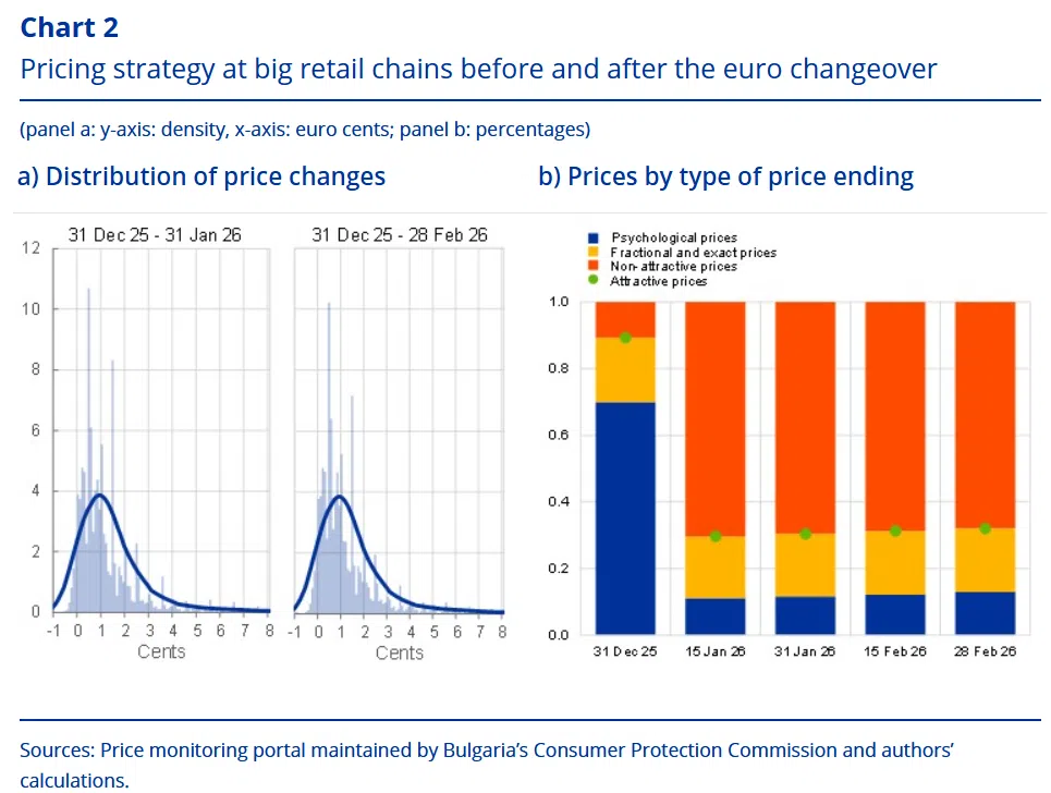 ЕЦБ допълва тези констатации с анализ на микроданни от търговски вериги в България. Те показват, че промените в цените по време на преминаването към еврото са били минимални и обикновено са възлизали само на няколко евроцента. Това сочи, че търговците на дребно са се придържали към фиксирания обменен курс и законовите правила за закръгляване. Не се наблюдават признаци за системни корекции на цените в посока нагоре.