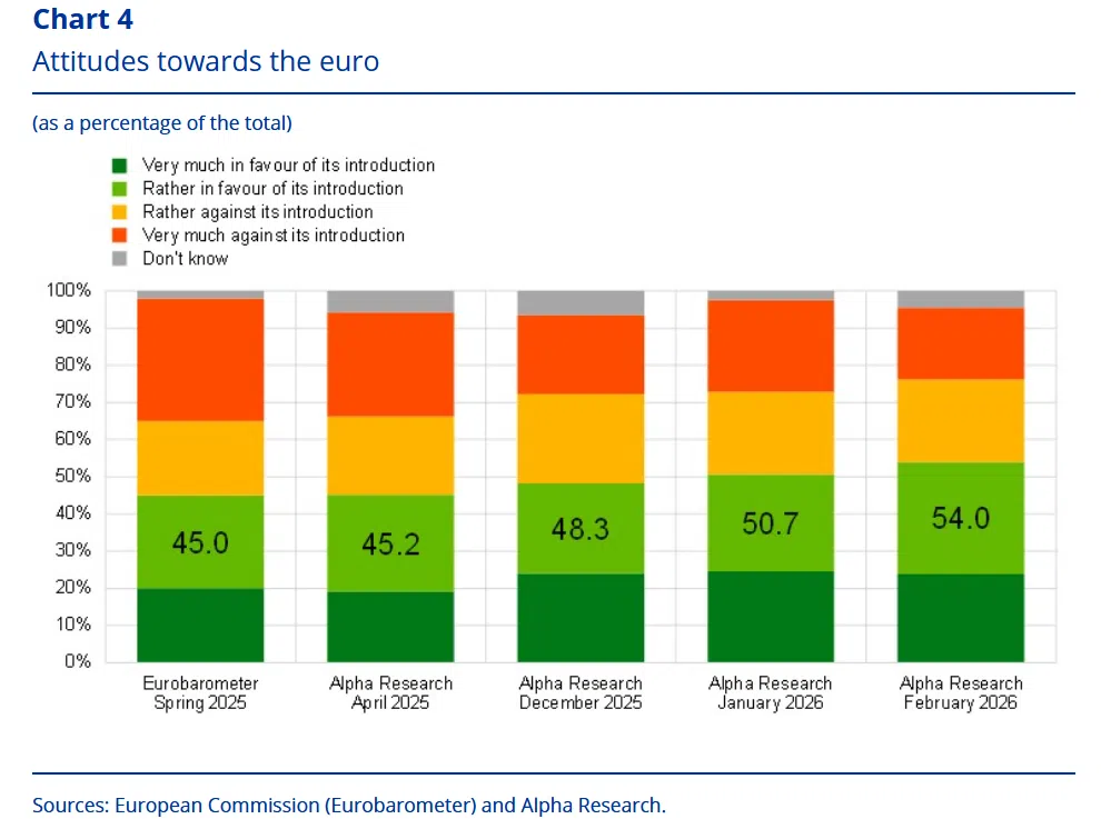 Проучванията показват, че тя не само надхвърля 50% през януари 2026 г., но и се повишава до 54% през февруари, което отбелязва подкрепа от мнозинството за първи път през последните години.