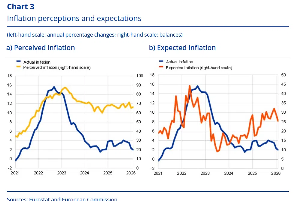 През януари 2026 г. възприеманата инфлация в България, както показват индикаторите, базирани на проучвания, отбелязва значителен спад – най-големият, регистриран от началото на пандемията, макар че все още преобладават респондентите, които съобщават за повишения на цените. Освен това измерената инфлация се забавя, а очакванията на потребителите за повишение на цените в следващите 12 месеца отслабват. Това сочи, че както възприеманата инфлация, така и инфлационните очаквания не са били засегнати от преминаването към еврото.