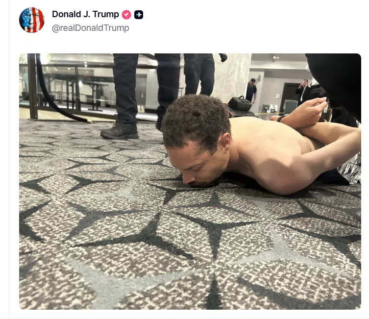 Преди пресконференцията Тръмп, сподели в Truth Social, снимки, на които се вижда предполагаемият стрелец, след като е бил неутрализиран, както и кадри от инцидента, заснети от камерите за сигурност.